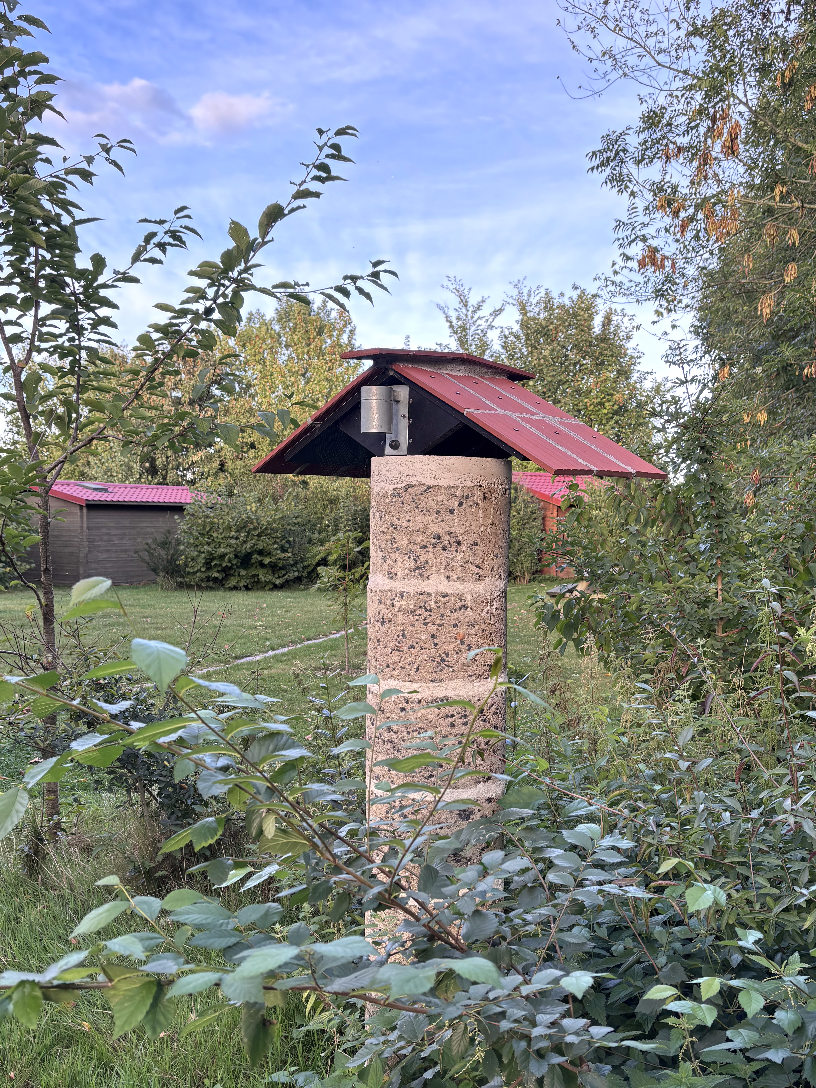 A lamppost in the form of a roofed, compressed earth column. A kind of wayfinding device, the motion-activated light guides the way from a camping ground to the public toilets during the dark evenings of the semi-rural location. Clayey subsoil was sourced from local groundworks contractor and the foundation constructed from demolition rubble from previous renovation works to the main barn.