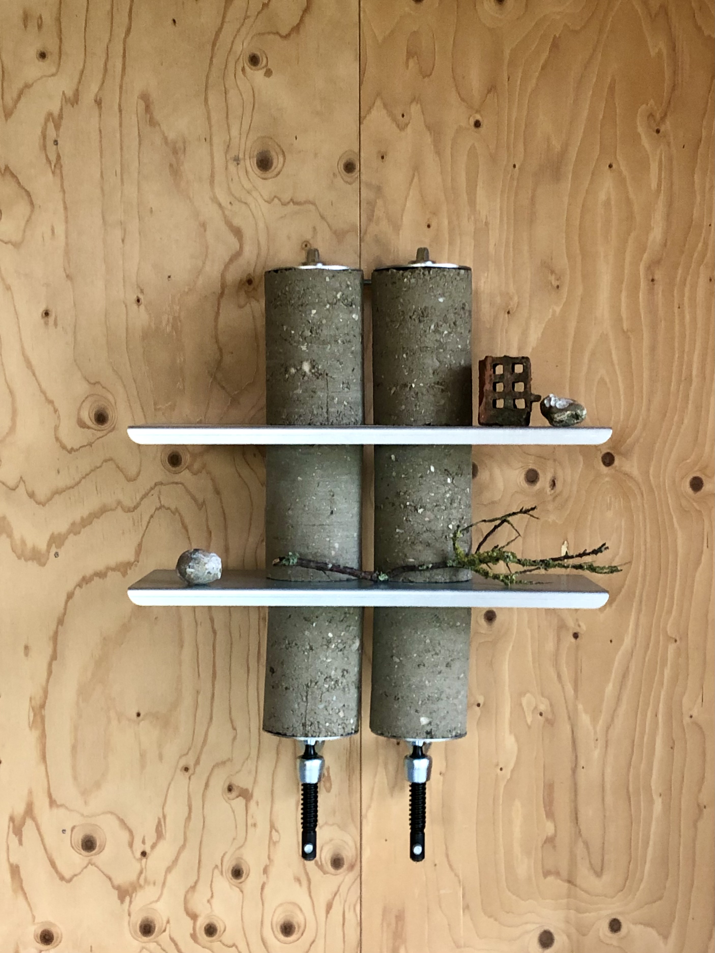 A sculptural shelf made from compressed raw earth (30% clay, 35% crushed shells, 35% sand) and galvanised steel. Outcome of research into the built and natural environment of Zeeuws Vlaanderen.
